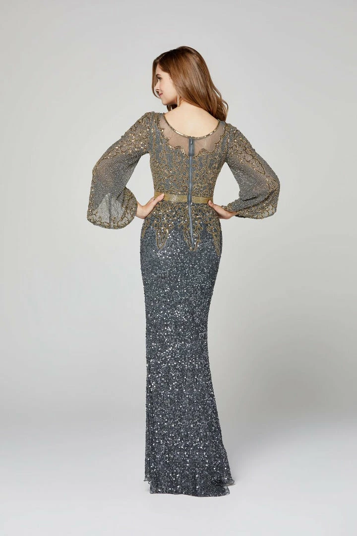 Primavera Couture 3378 sheer scoop neckline beaded long evening gown with sheer flared bell sleeves. Modest formal dress mother of the bride or groom or wedding guest dress. Military Ball or Gala Dress.Â