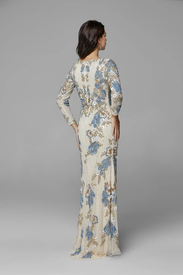 Primavera Couture 3675 This long hand beaded evening gown has a lovely beaded floral pattern. The dress has a high sheer neckline a full coverage back and long sleeves.