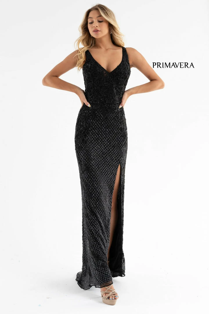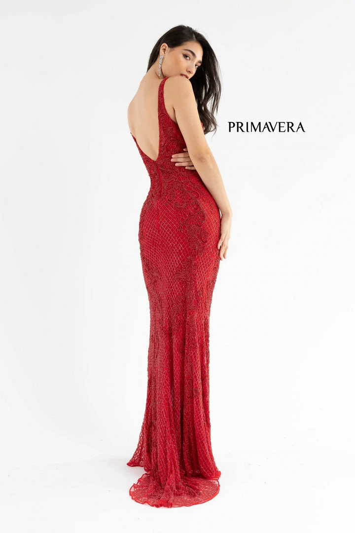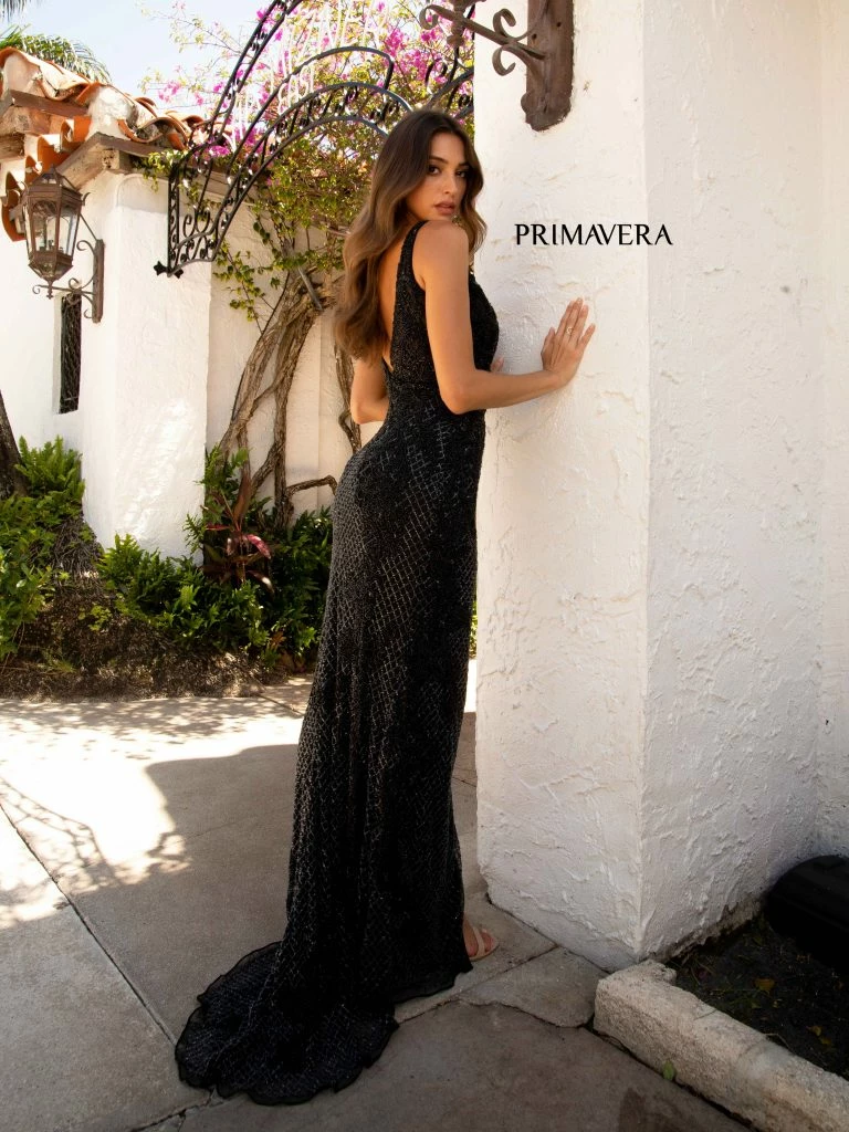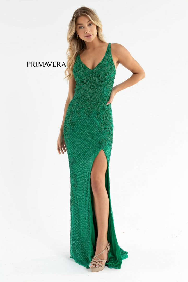 Primavera Couture 3750 This is a long beaded prom, pageant or formal evening wear dress with a v neckline and a mid back open v.Β The top is fully beaded with a scrolling pattern that streams down the hips and skirt to the floor length sweeping train.Β It also has a slit in the skirt.