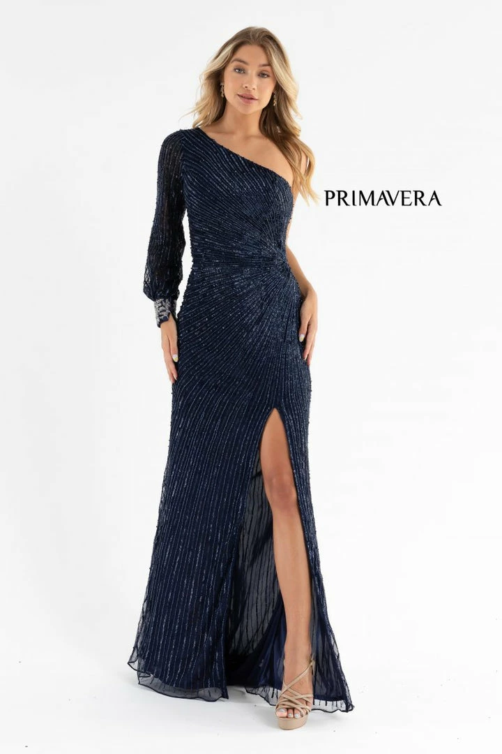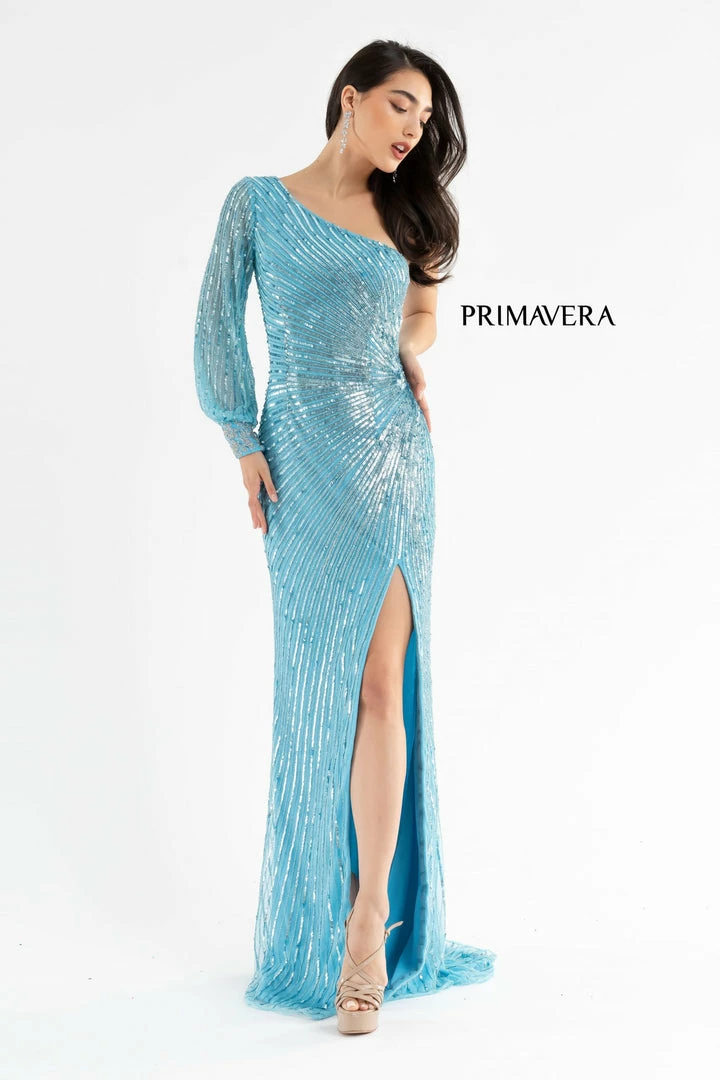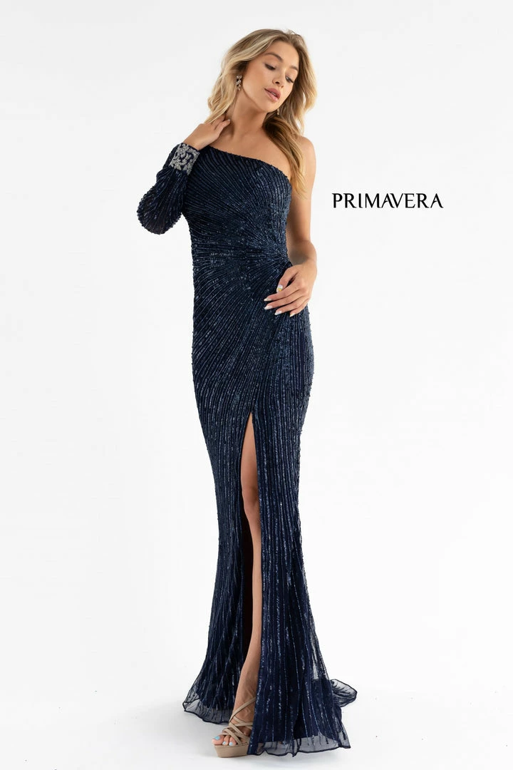 Primavera Couture 3757 Prom, Pageant Dress and Formal Evening Gown. This is an up to date styled sequined evening gown with one shoulder embellished cuff sleeve. The sequins are beaded in streaming lines all headed for the left waistline. This prom dress also has a slit and sweeping train.