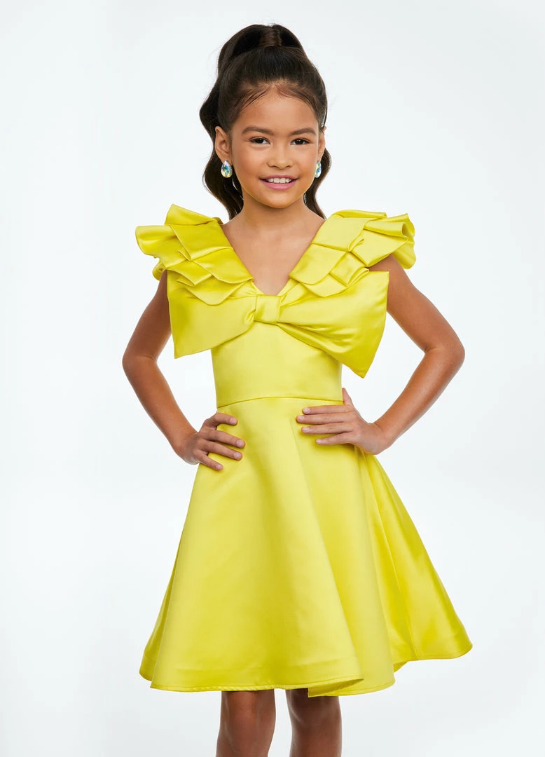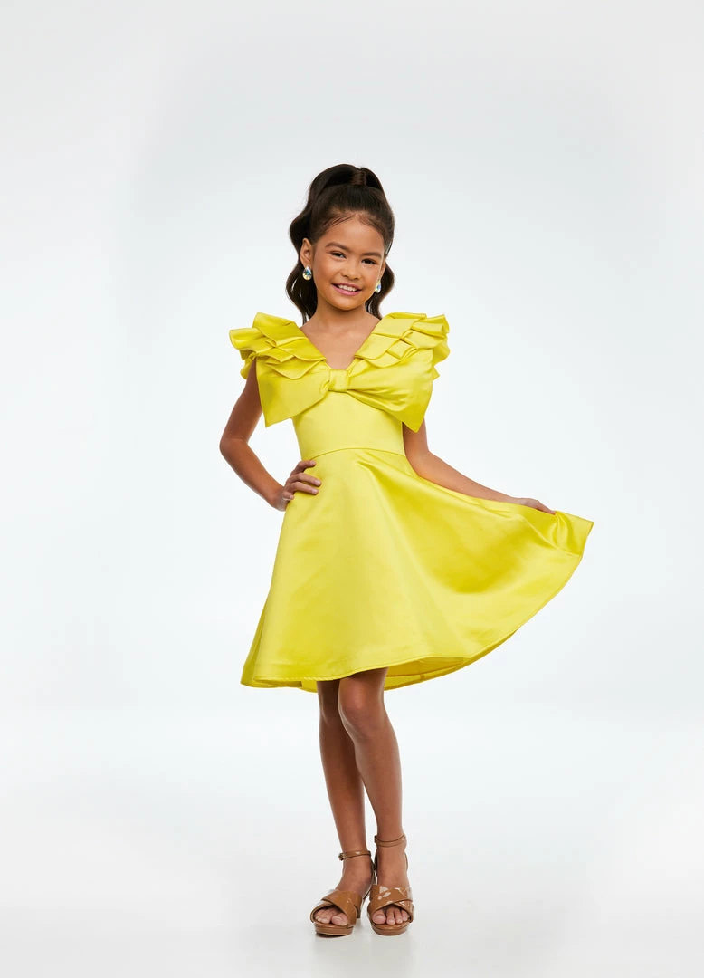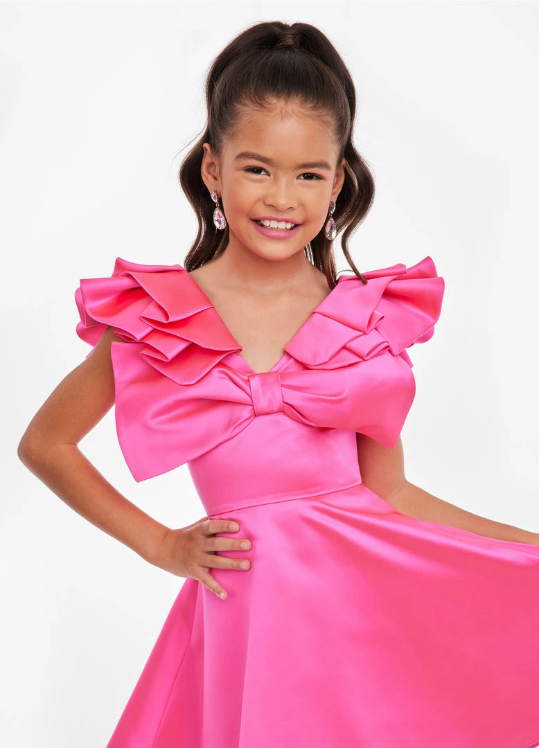 Ashley Lauren Kids 8081 Girls short satin Pageant Cocktail Dress Ruffle Bows v NeckΒ This ultra fabulous satin cocktail dress features a v-neckline accented by ruffle shoulders. The bustier is embellished with a large bow.