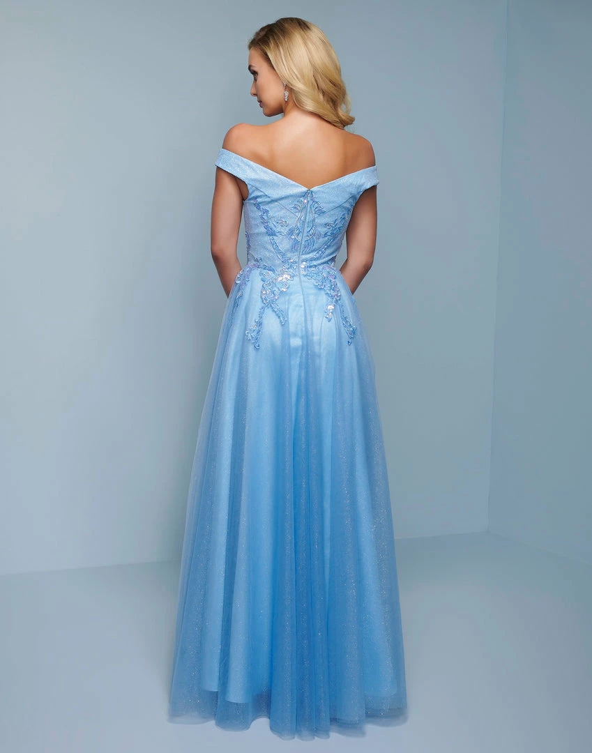 Splash Prom K532 This is a blue off the shoulder glitter tulle prom dress. This long pageant evening gown has an embellished lace bodice and tulle skirt.Â