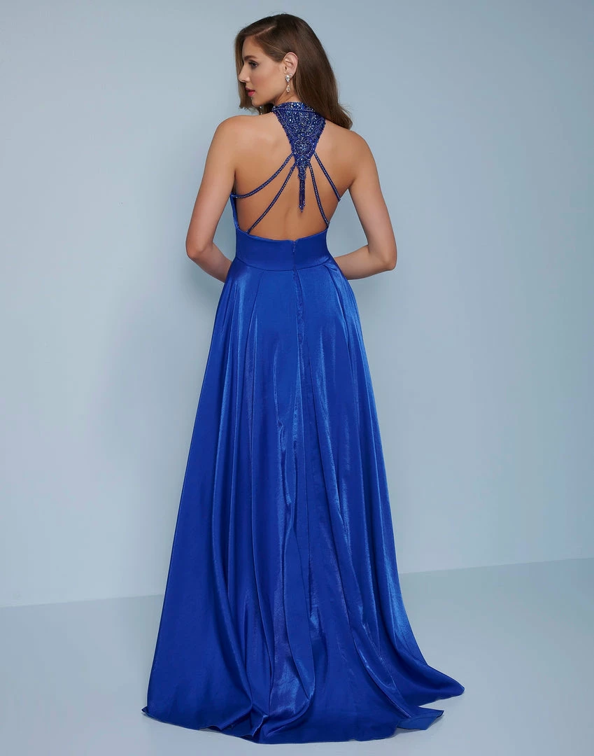 Splash Prom K541 This is a high neckline satin prom dress with sheer illusion panel in the bodice. This evening pageant gown has an embellished triangle in the back with tassels flowing down and embellished straps flowing you’re back. It ends with a sweeping train.