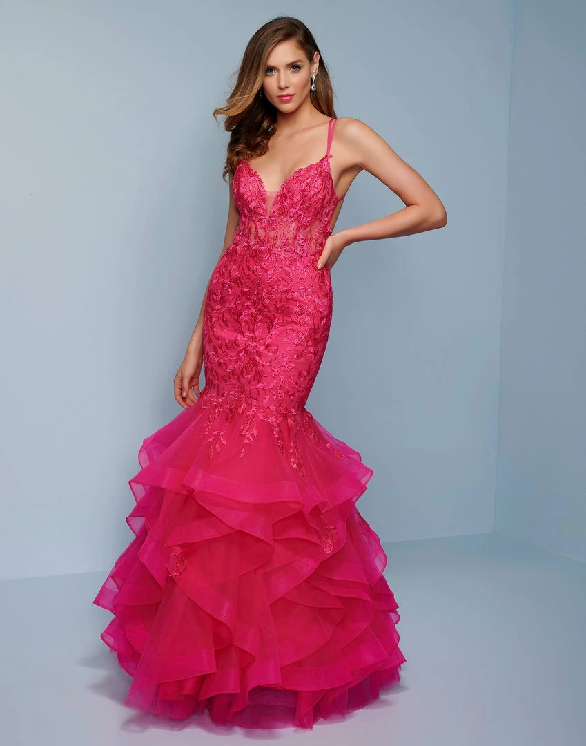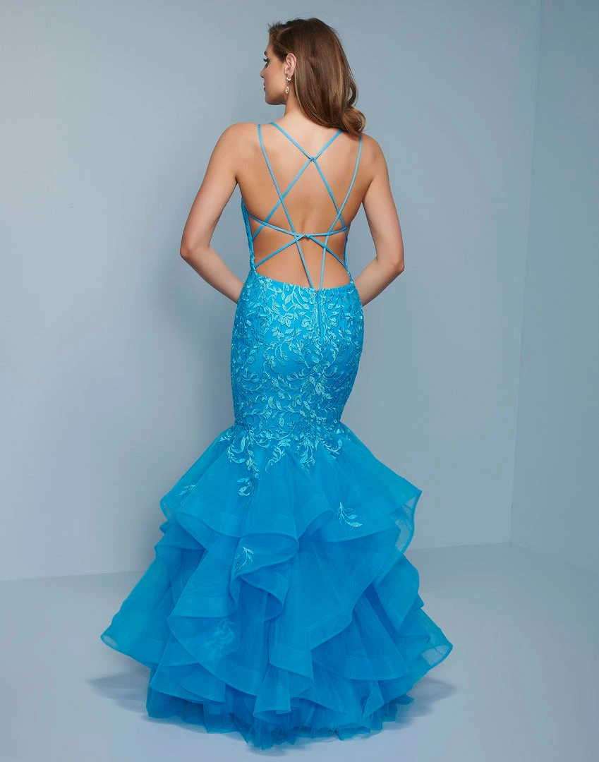 Splash Prom K551 This is a long embellished lace mermaid prom and pageant dress. This formal evening gown features a plunging v neckline with a mesh panel and straps that create a strappy design in the open back. The midriff is sheer to show the lace embellishments. The floor length skirt ends in ruffle tulle with horsehair trim for added fullness and has areas of the embellished lace throughout.