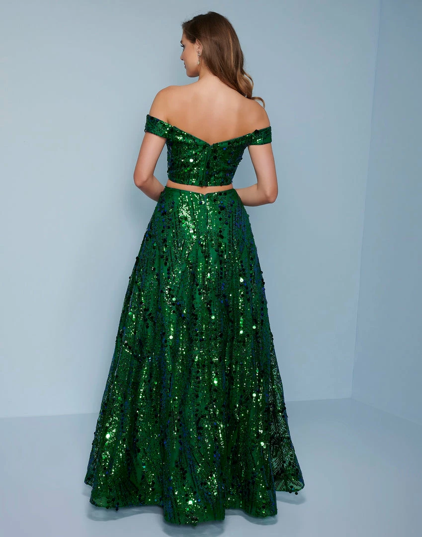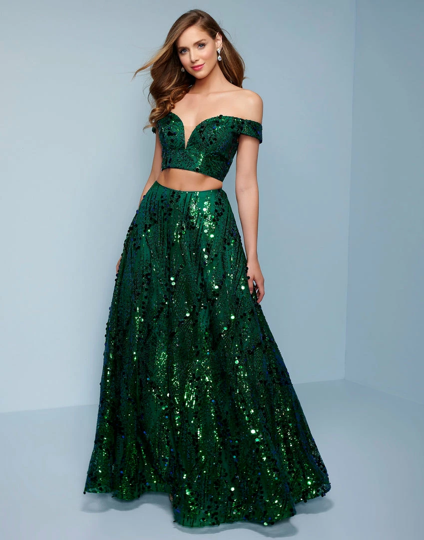 Splash Prom K556 This is an off the shoulder two piece A line prom dress with paillette sequins.Â
