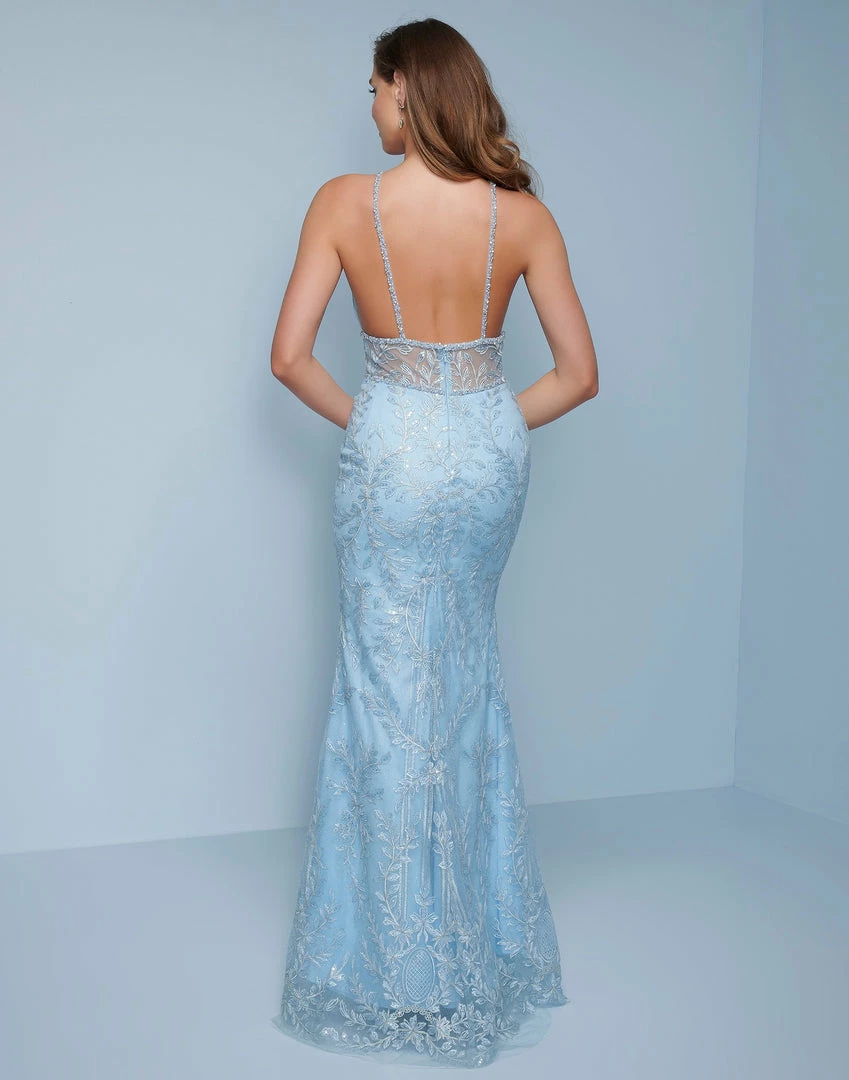 Splash Prom K558 This is a high neckline lace column prom dress. This evening gown has an illusion panel in the bodice, sheer midriff and sheer back.Â