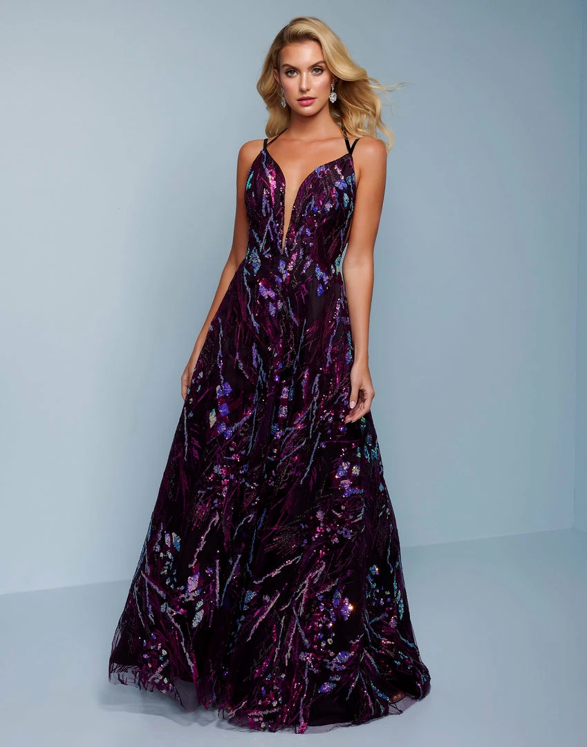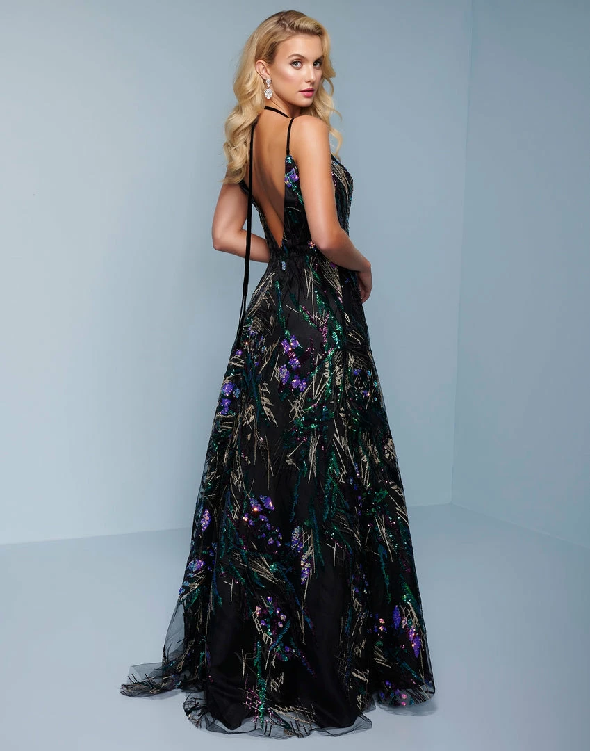 Splash Prom K565 This is a sequin A line prom dress with a halter tie neckline. This formal evening gown is backless.