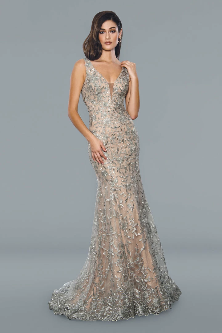 Mermaid Dresses Jovani 03023 Sheer Feather Prom Dress Plunging Neck Wedding Gown Pageant Gown