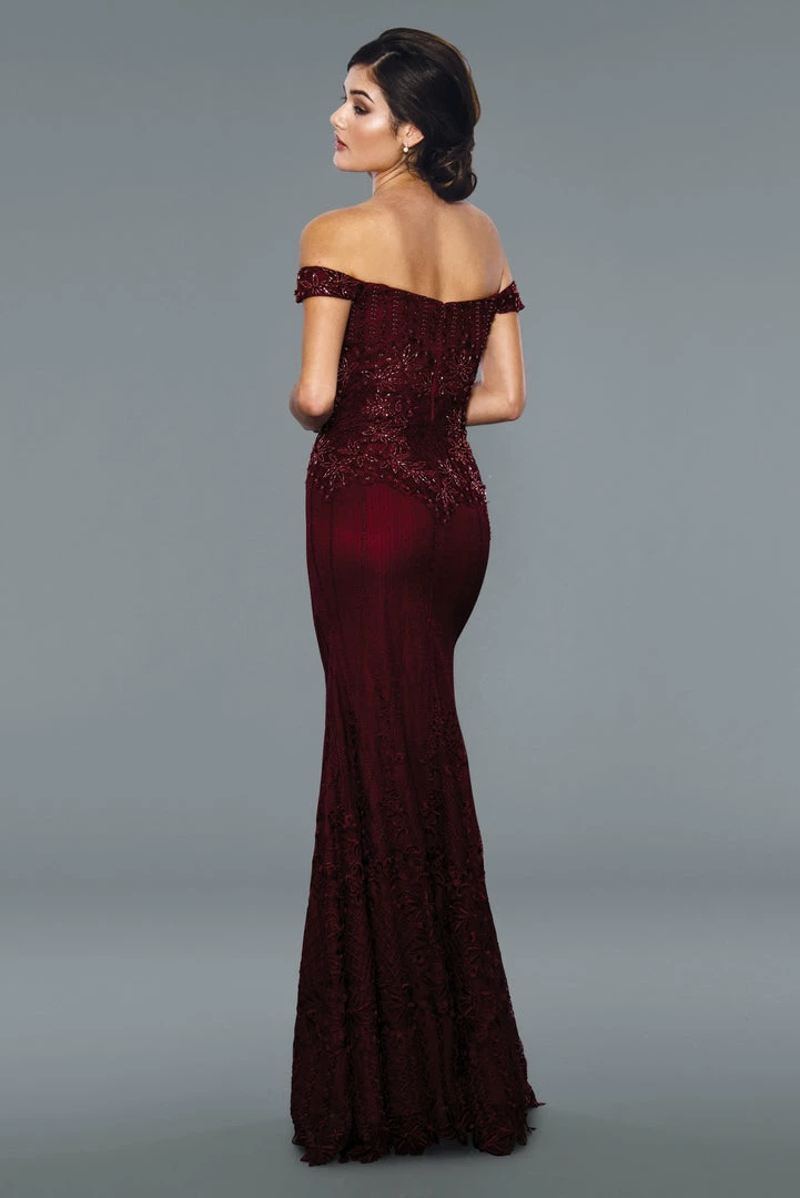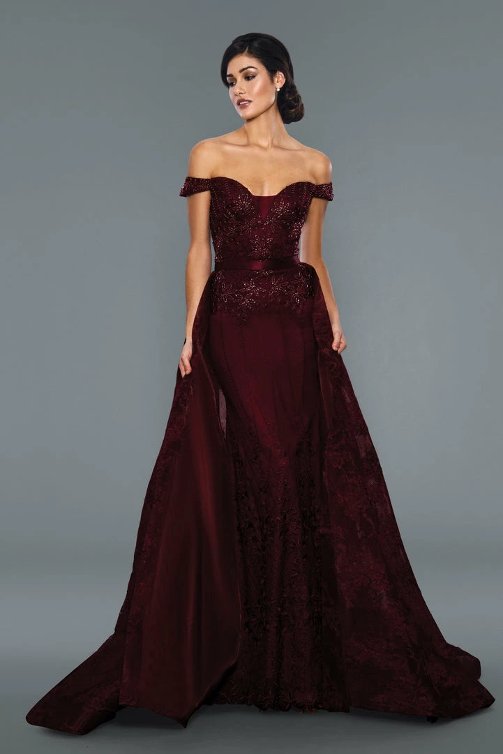 Stella Couture 22067 Long Lace off the shoulder Formal Dress Overskirt Burgundy
