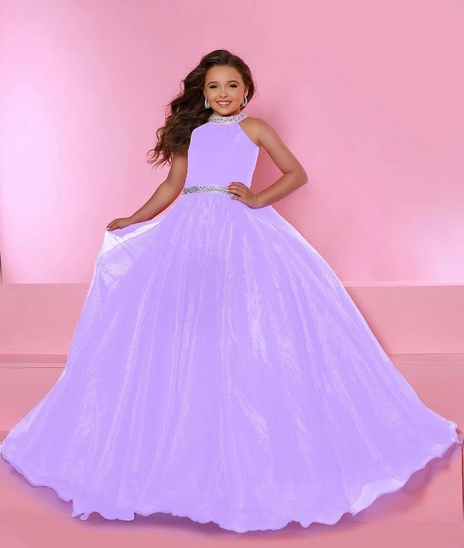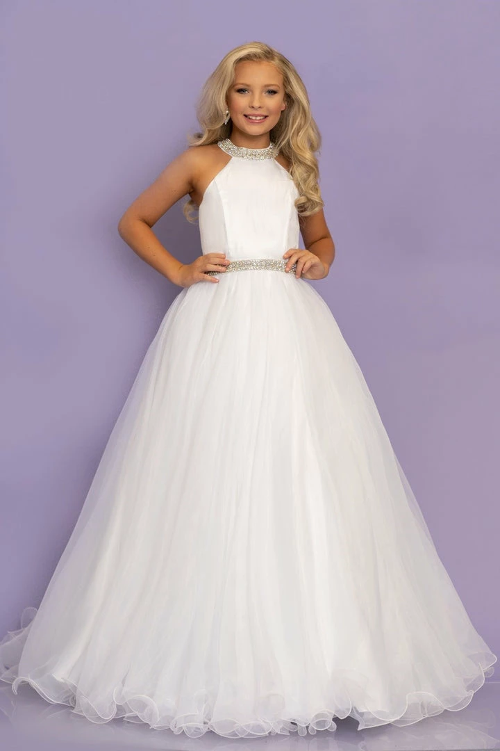 Sugar Kayne C114 by Johnathan Kayne is an Organza Girls A Line Pageant Dress. Featuring a satin lining this high neckline is Embellished with crystal rhinestone accents. The waist line is broken with a crystal bling belt. The lush Ball gown skirt features a horse hair trim. Glide across the stage in the classic beauty!