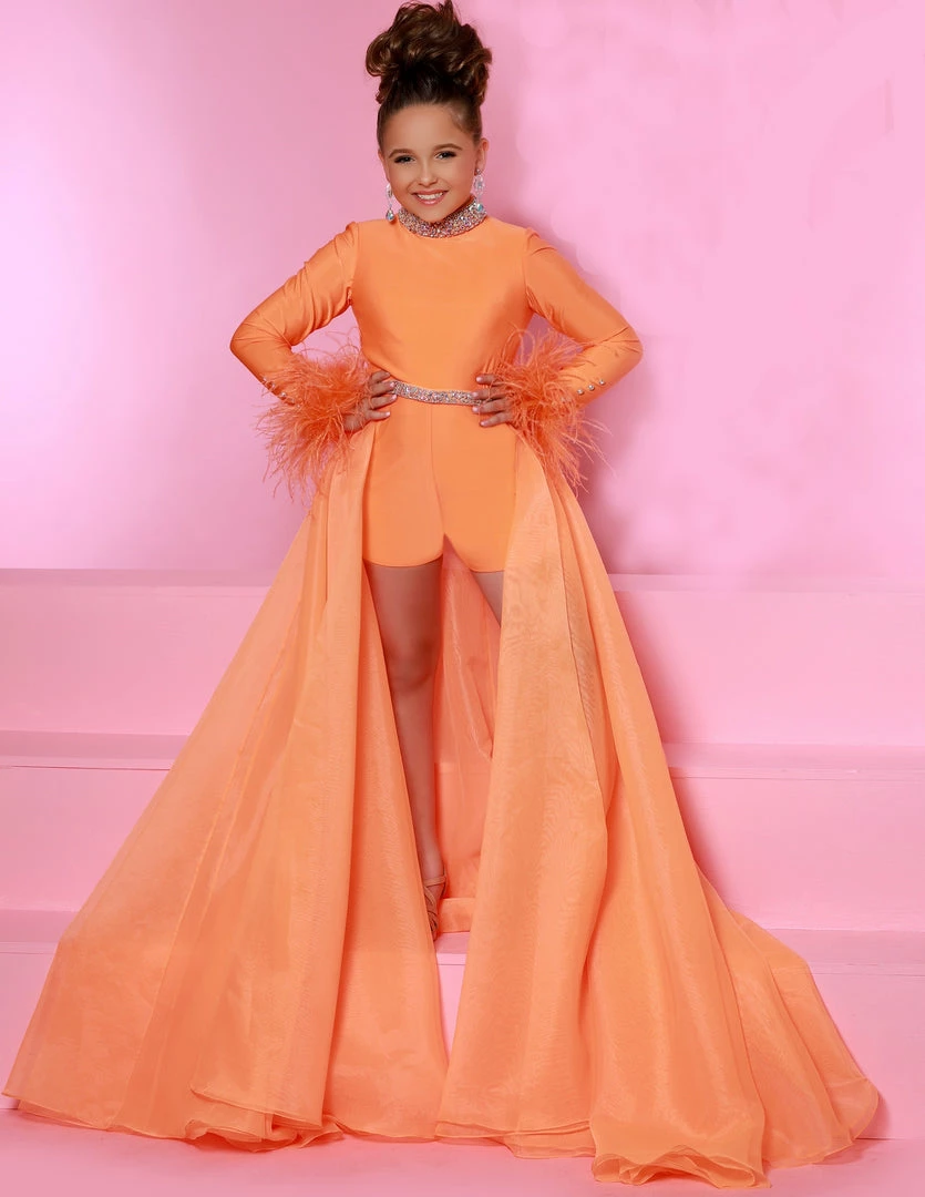 Sugar Kayne C127 by Johnathan Kayne is a girls and preteens pageant romper with dramatic long sleeves trimmed in showy buttons and feathers. It features an embellished high neckline with a cutout in the back. The embellished waistline flows into a layers of full long overskirt. It is made of 4 way stretch lycra with an organza overskirt.Â