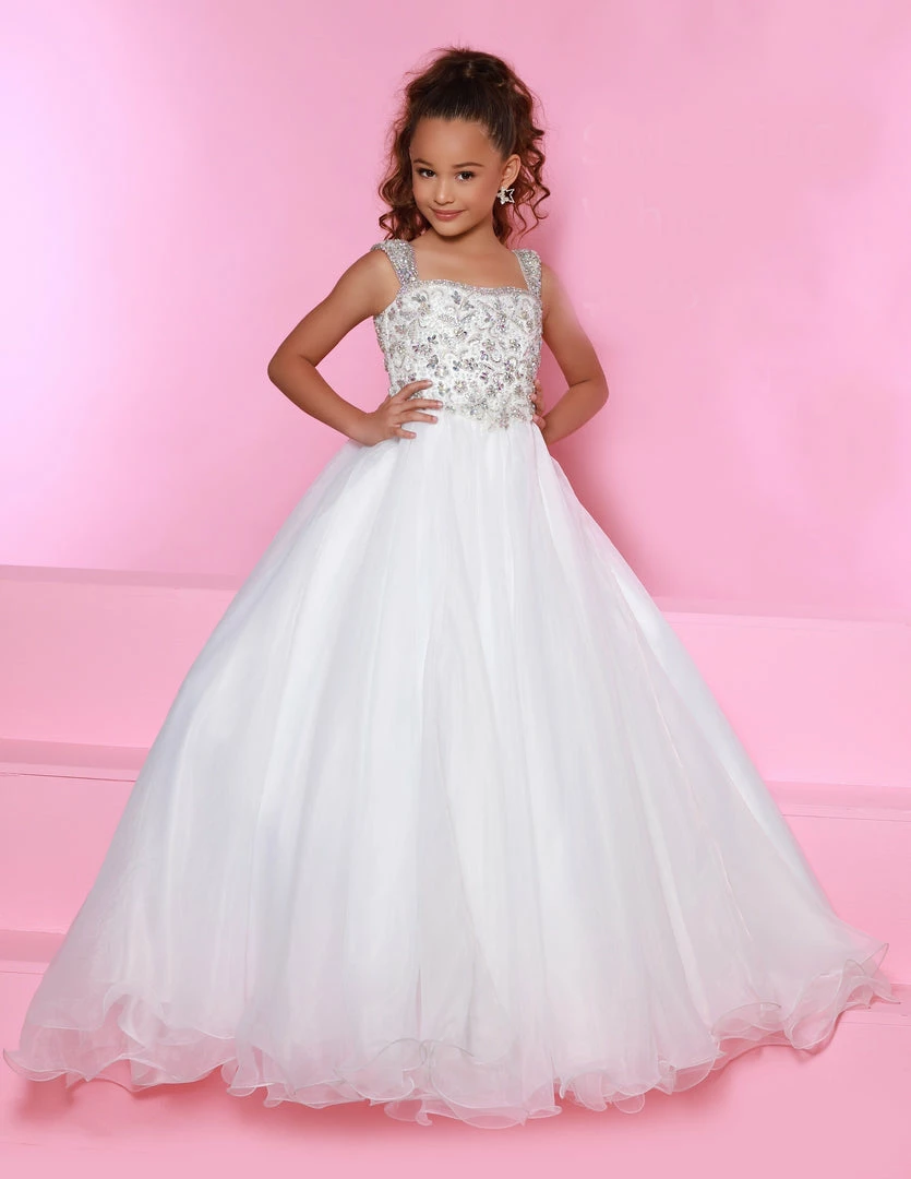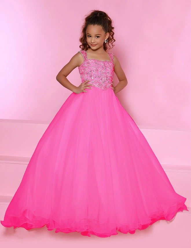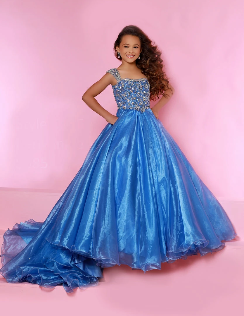 Sugar Kayne C146 Girls Pageant Dress. This lush pageant ballgown is made of flowy organza fabric. The top is embellished with semi sweetheart neckline and cap sleeves. Float on the stage in this full flowy pageant ballgown for girls and preteens.