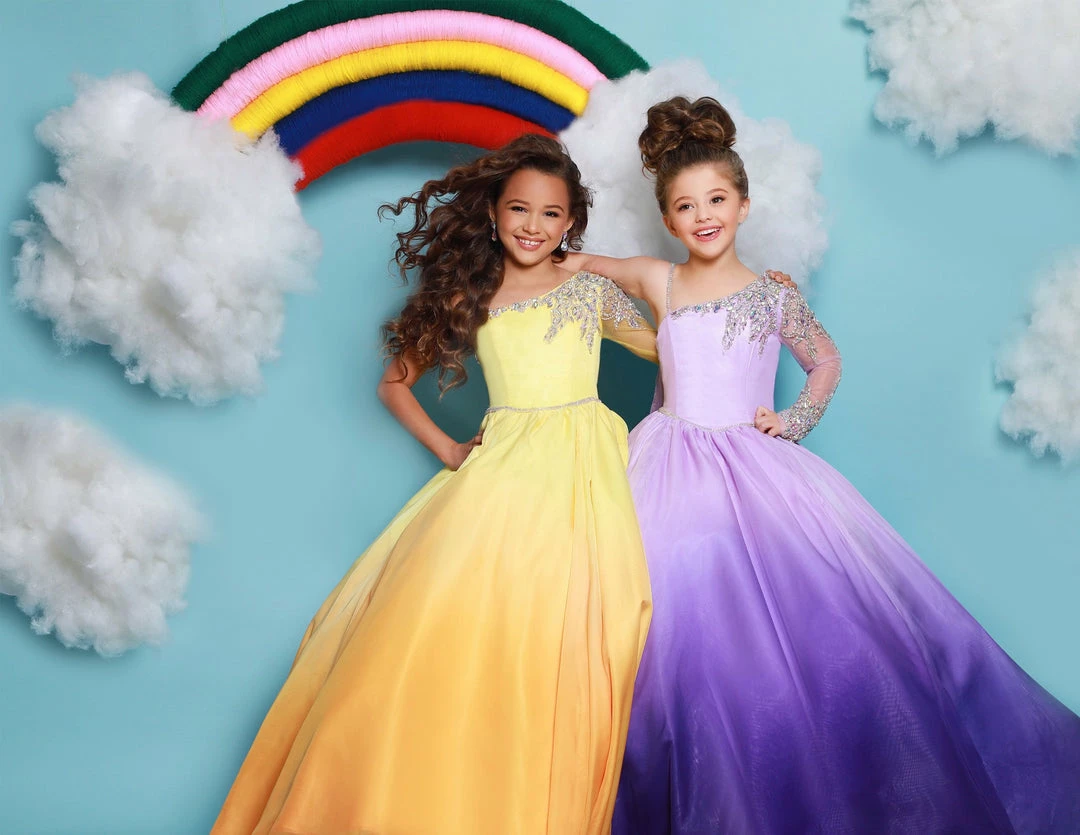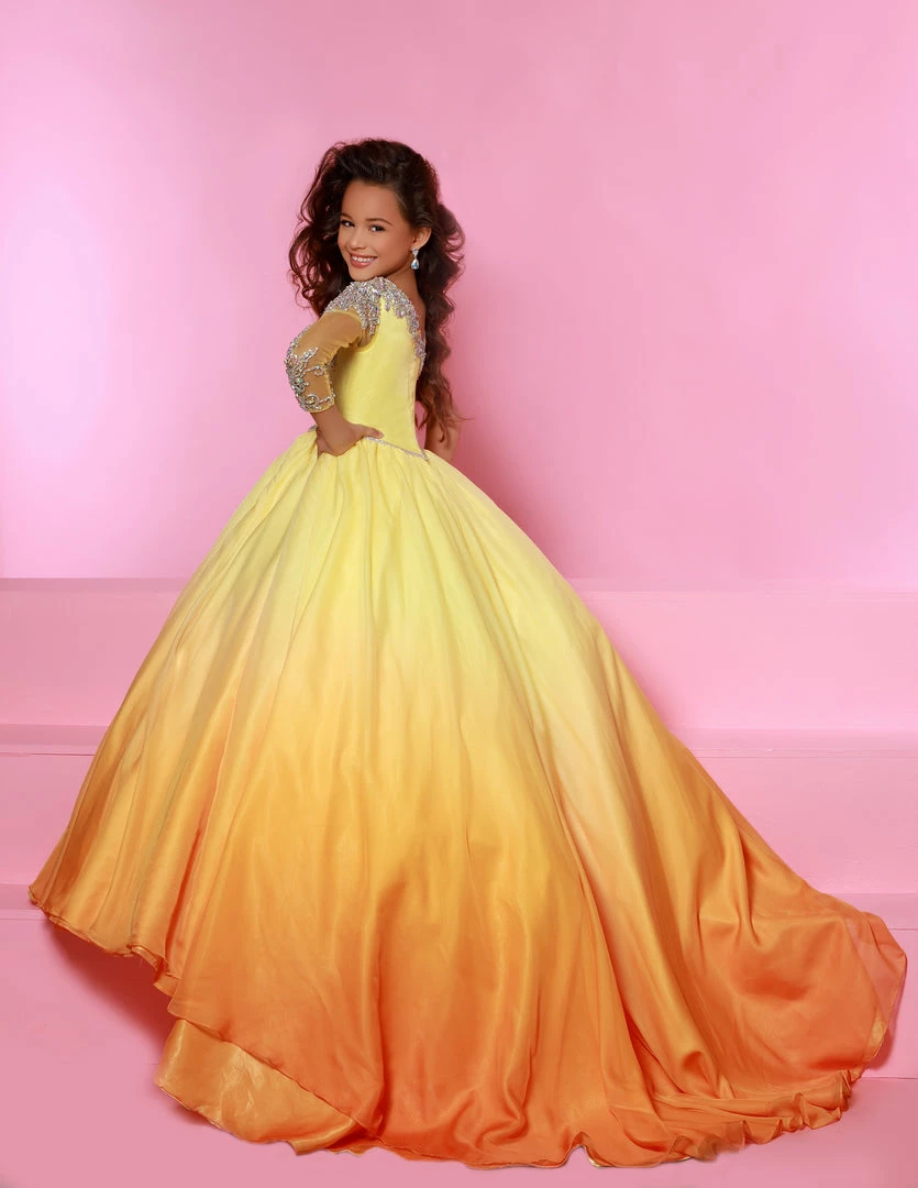 Sugar Kayne C160 is a Girls A Line Ballgown Pageant Dress. Featuring an Ombre Color shift as well as a flowing cape. One shoulder long sleeve with embellishments. The gown has an embellished waist and long chiffon ball gown with a train. Ombre to perfection in this chiffon gown. The one-shoulder style has a beaded mesh sleeve with asymmetrical beading and a detachable ombre chiffon cape finishes the look.