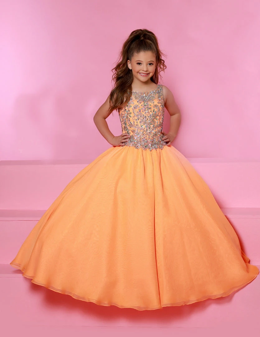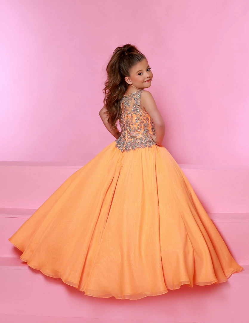 Sugar Kayne C161 is a long A Line Girls Ballgown Pageant Dress. Fully embellished high neckline and fitted bodice. It has a long chiffon ball gown skirt.