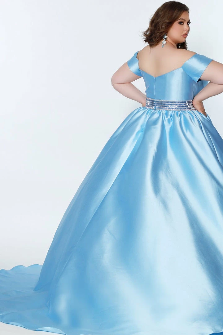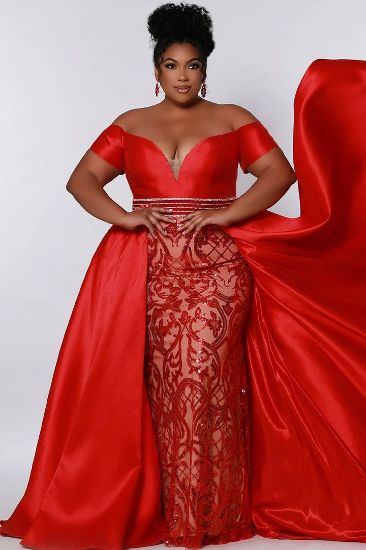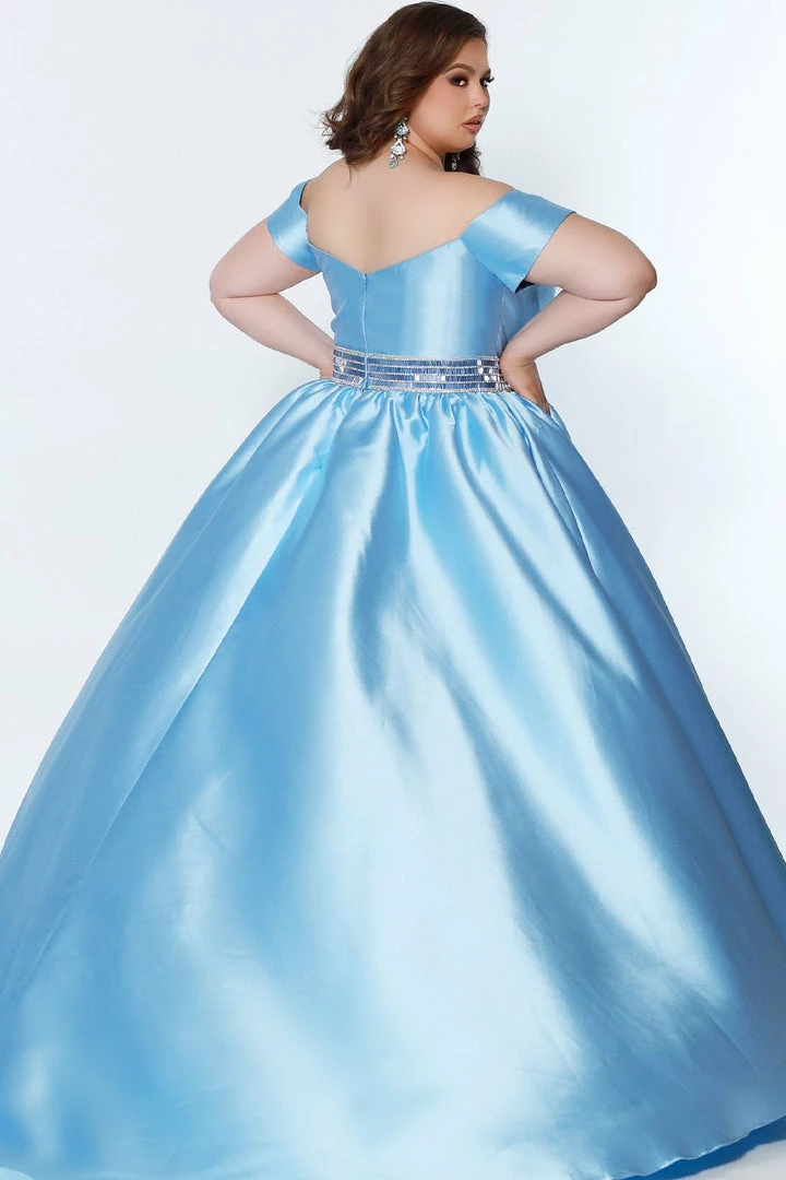 Johnathan Kayne for Sydney’s Closet JK2213 Plus Sized Prom, Pageant and Formal Evening Wear Dress  Category is…fierce and fabulous! This gown is perfect for pageants, but no matter where, you’ll steal the show in two hot shades of light blue or radiating red! Rock your curves in this sequin mesh skirt silhouette, and mikado satin bodice with plunging sweetheart neckline and cuff sleeves. Then, prepare for flair with the mikado satin hostess overskirt, complete with a layer of crinoline. JK 2213