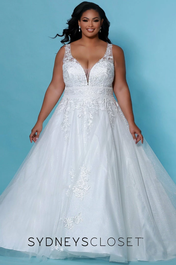 Sydney’s Closet SC5255 HAZEL Wedding Dress Shimmer Lace Bridal Ball Gown. Curvy brides love this A-line silhouette wedding dress for it’s flattering and oh-so comfortable fit. Pretty floral lace appliques splashed on the bodice create a romantic look. Glitter tulle on the second layer of the skirt creates a dreamy touch. SC 5255