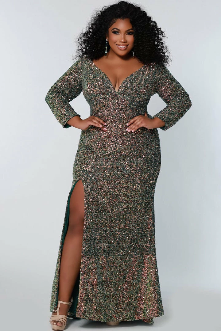 Sydney’s Closet SC7333 This evening gown is fitted and features a V neckline and long sleeves.Β It has a slit that starts 15 inches from the waistline.