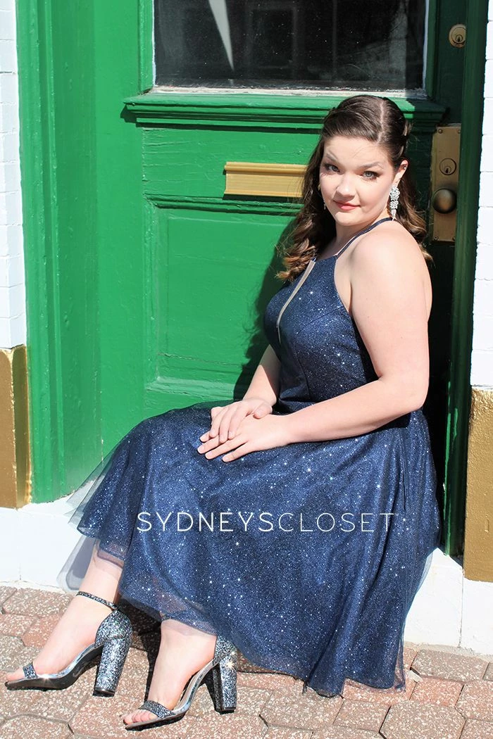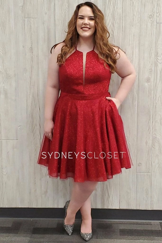 Sydney’s Closet 8106 This short homecoming cocktail dress has a shimmer crew neckline with a sheer mesh panel and is knee length. It has a wide keyhole back with a lace up corset. This is a great choice for your next prom, graduation, homecoming or party. This dress has it all, including pockets!
