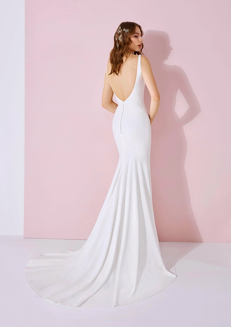 Glowing mermaid gown in white crepe with smooth façade, thin plunge, and a low, open back that finishes in a sweet line of buttons.