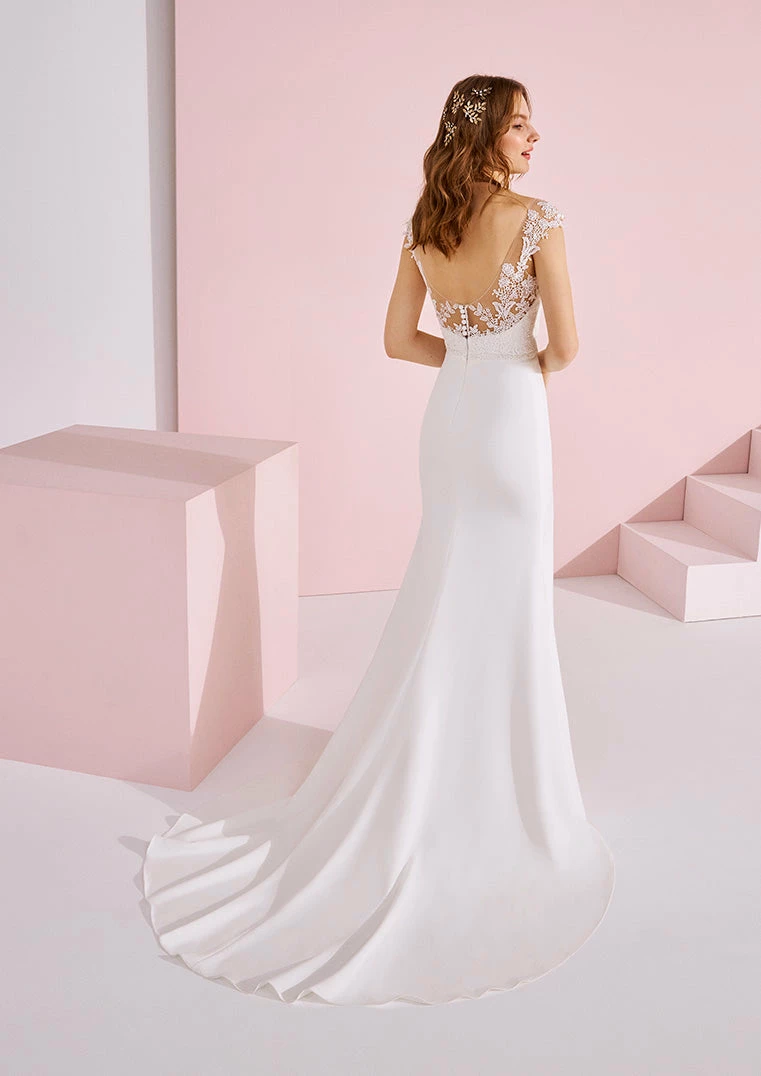 Mermaid gown featuring a soft, crepe base, illusion cap sleeves, and darling guipure lace that lines the shoulders, sweetheart neckline and finishes at a pearly waistline of beaded embroidery.