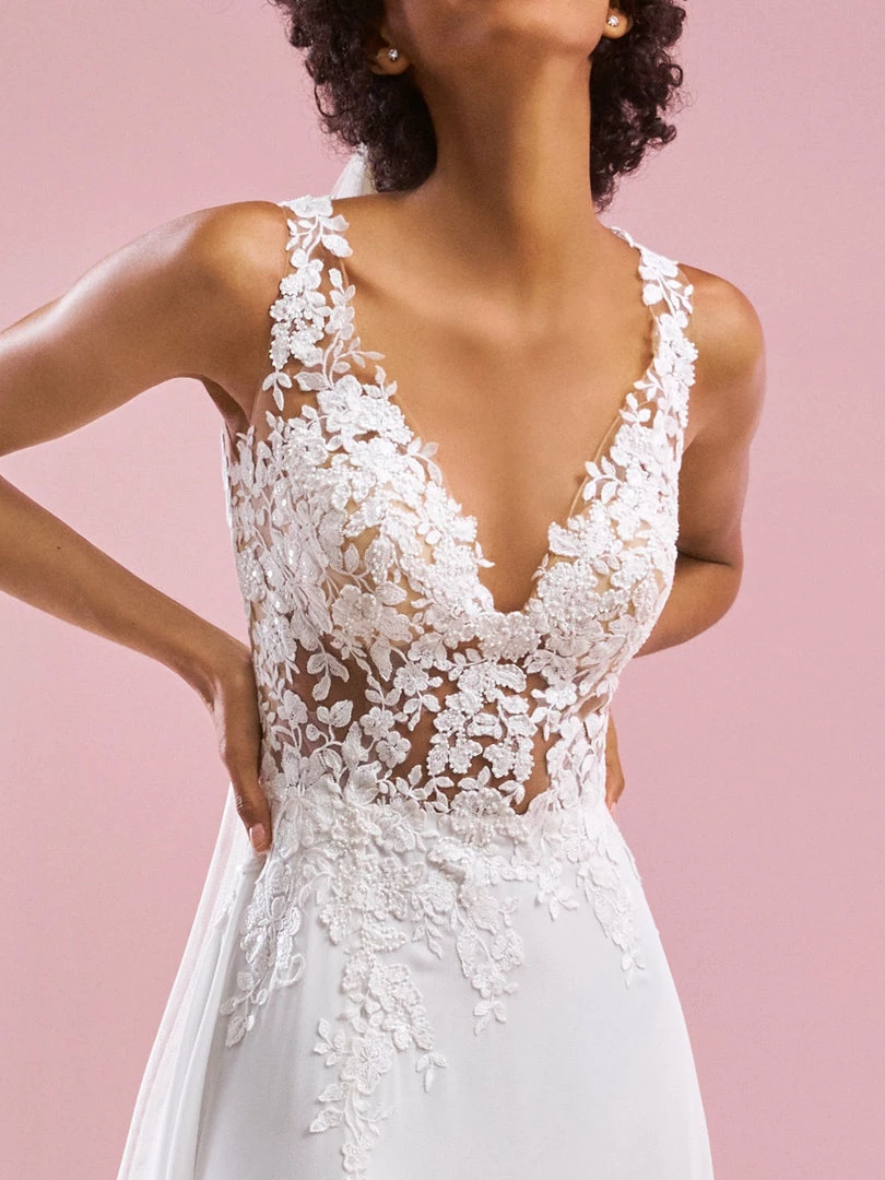 Fit with a high slit and an illusion bodice, this sheath gown features elegant cuts of leafy lace on the straps, bust, and waist, all dotted with pearly beading for a lightly textured contrast with the Georgette skirt.