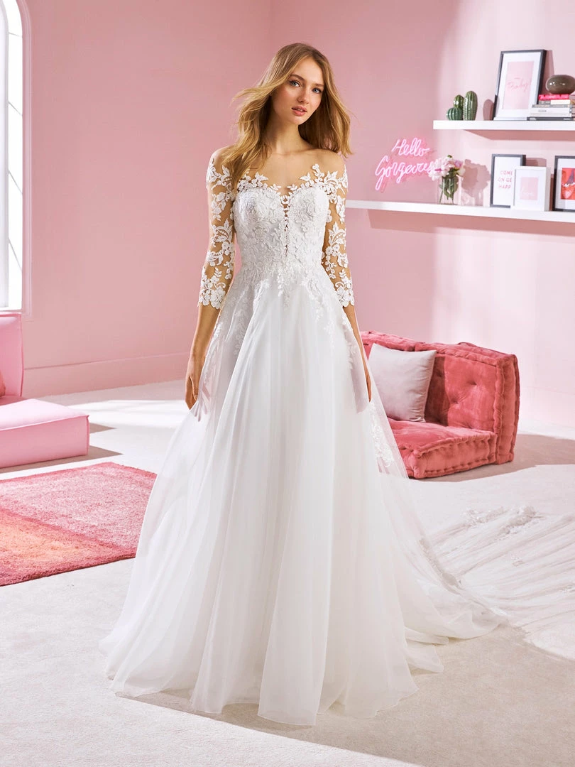 This A-line gown features a slim plunge bodice with an illusion overlay blooming with sequined cuts of curling florals that travel over the bust and frame the waist before introducing a sleek tulle skirt.