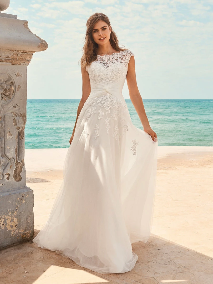 Elegant princess wedding dress in tulle with lace appliqués on the bodice. The crew neckline is combined with an original draped bodice in tulle, with contrasting lace appliqués.