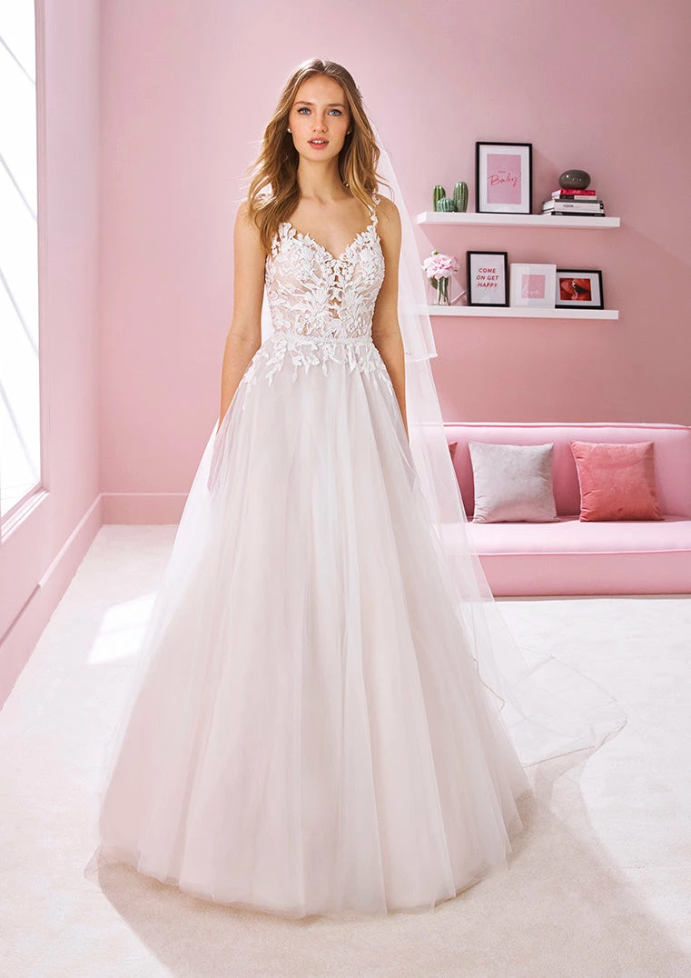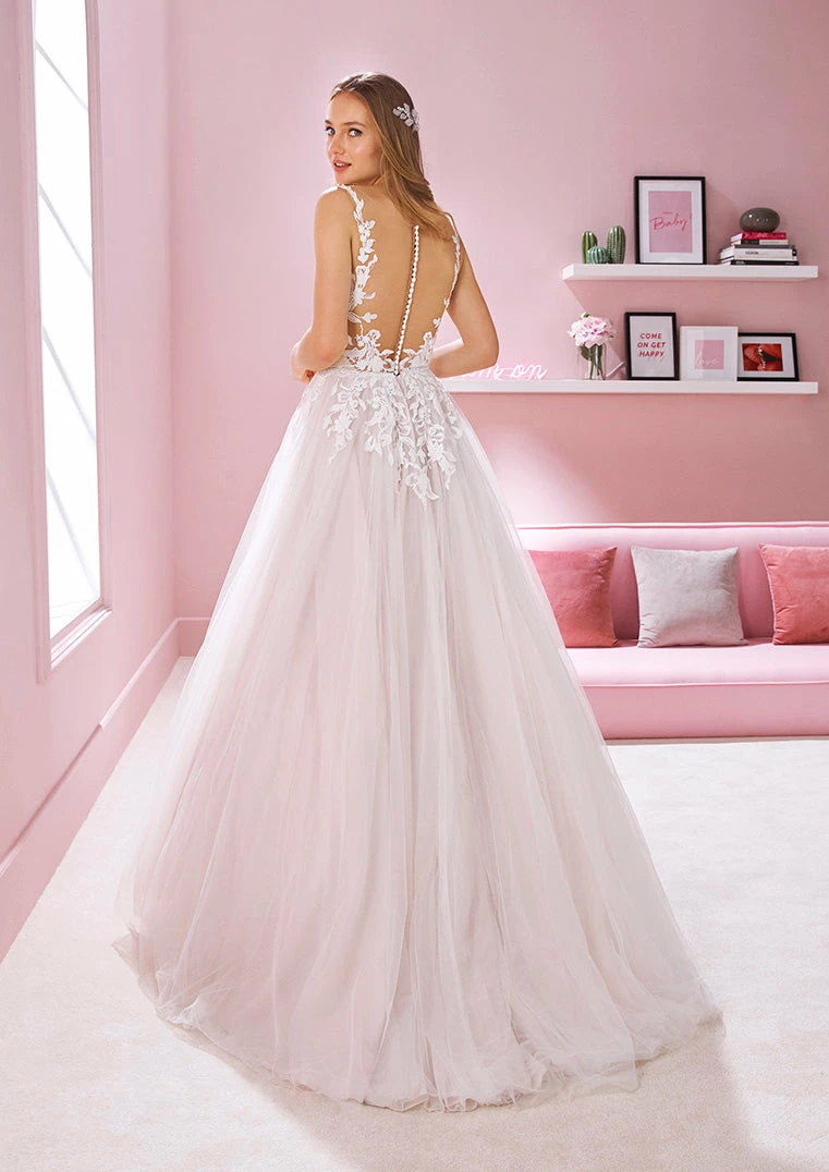 Princess gown featuring plunge bodice with illusion tulle overlay and beaded lace that unites with soft tulle skirt in a subtle, sparkling waistband.