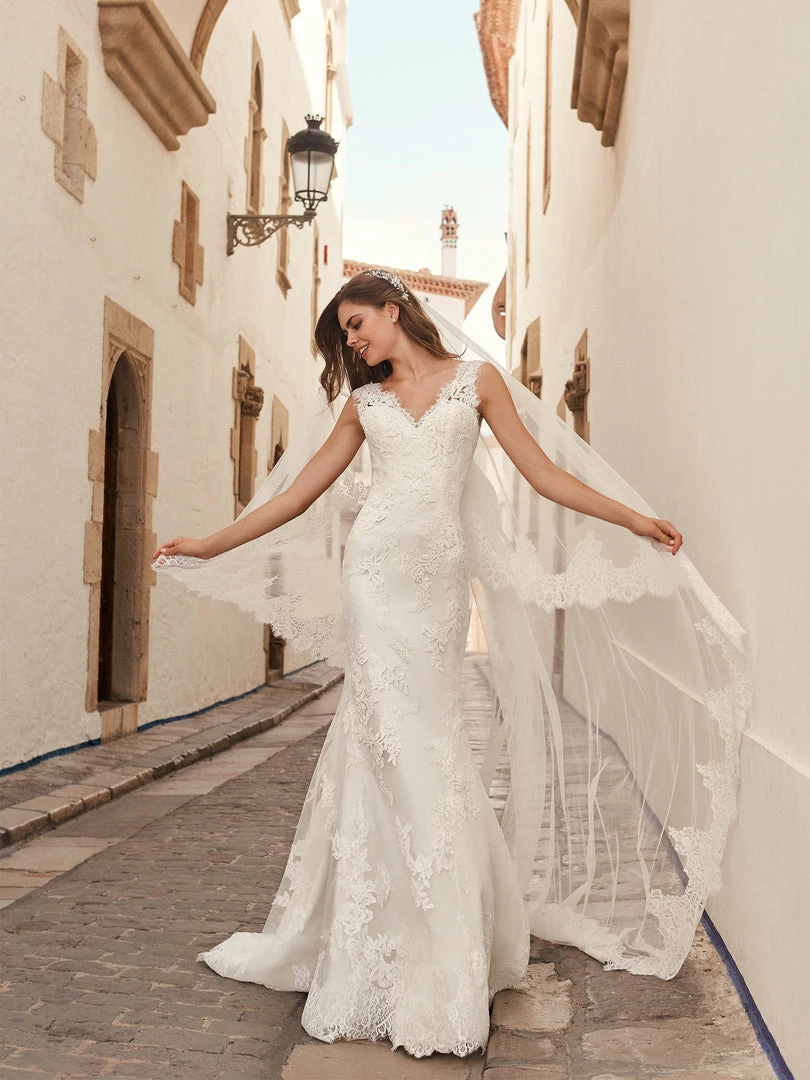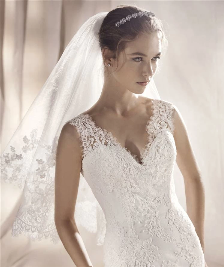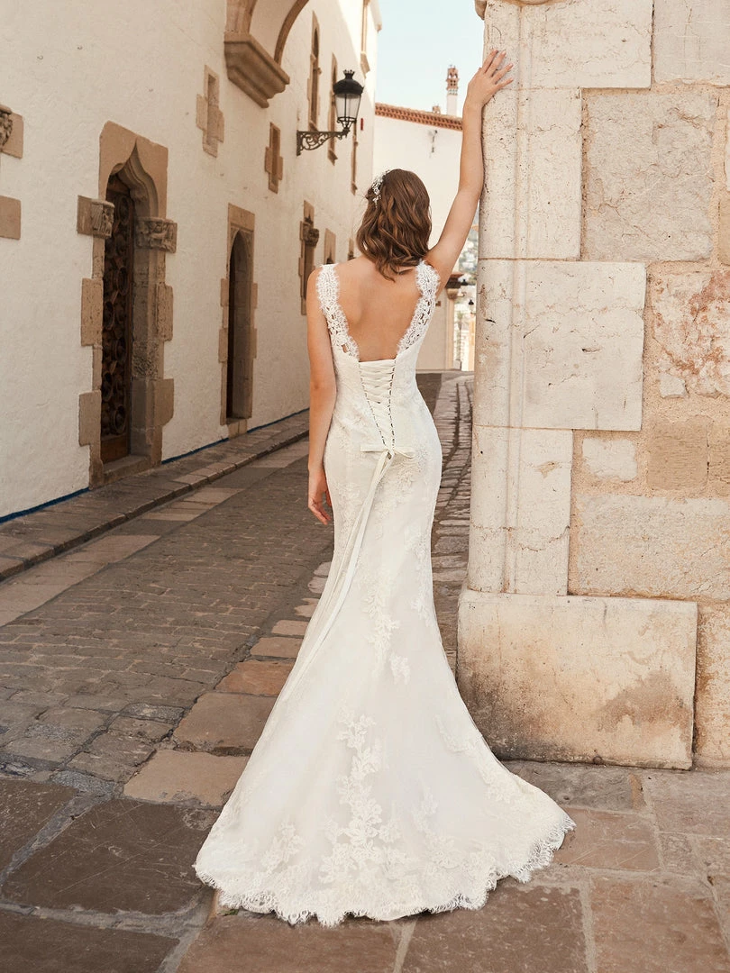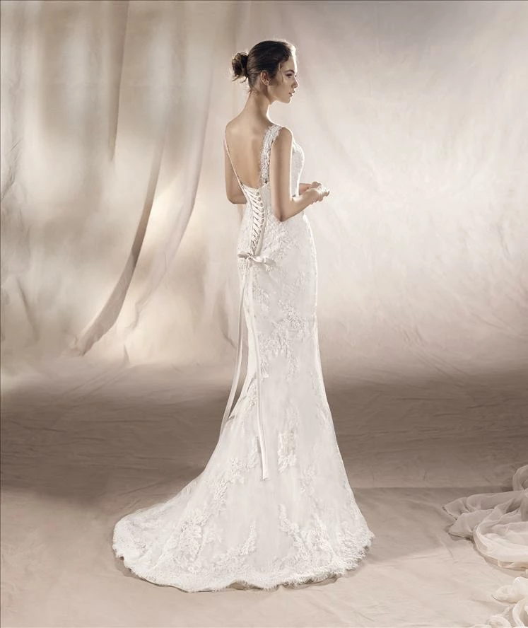 Mermaid wedding dress with V-neck and lace, thread embroidery and beaded appliqués. The ribbon lacing on the back makes the bodice hug the body corset-style.