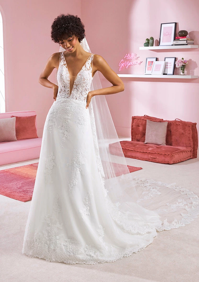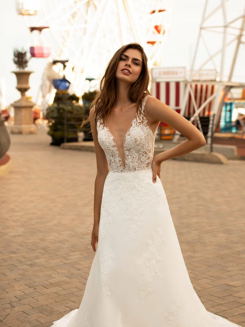 A sweet A-line gown with illusion straps and a plunge bodice lined with delicate beads that frame a collage of layered placements along the bust, hips, and soft white skirt.