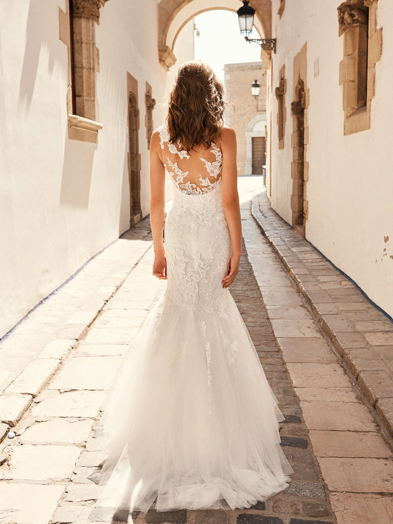 Mermaid cut wedding dress in tulle, with illusions and embroidered tulle. A sweetheart neckline under crystal tulle with lace and thread embroidery appliqués that blend into the skin creating a second-skin effect on the back and a bateau illusion neckline.